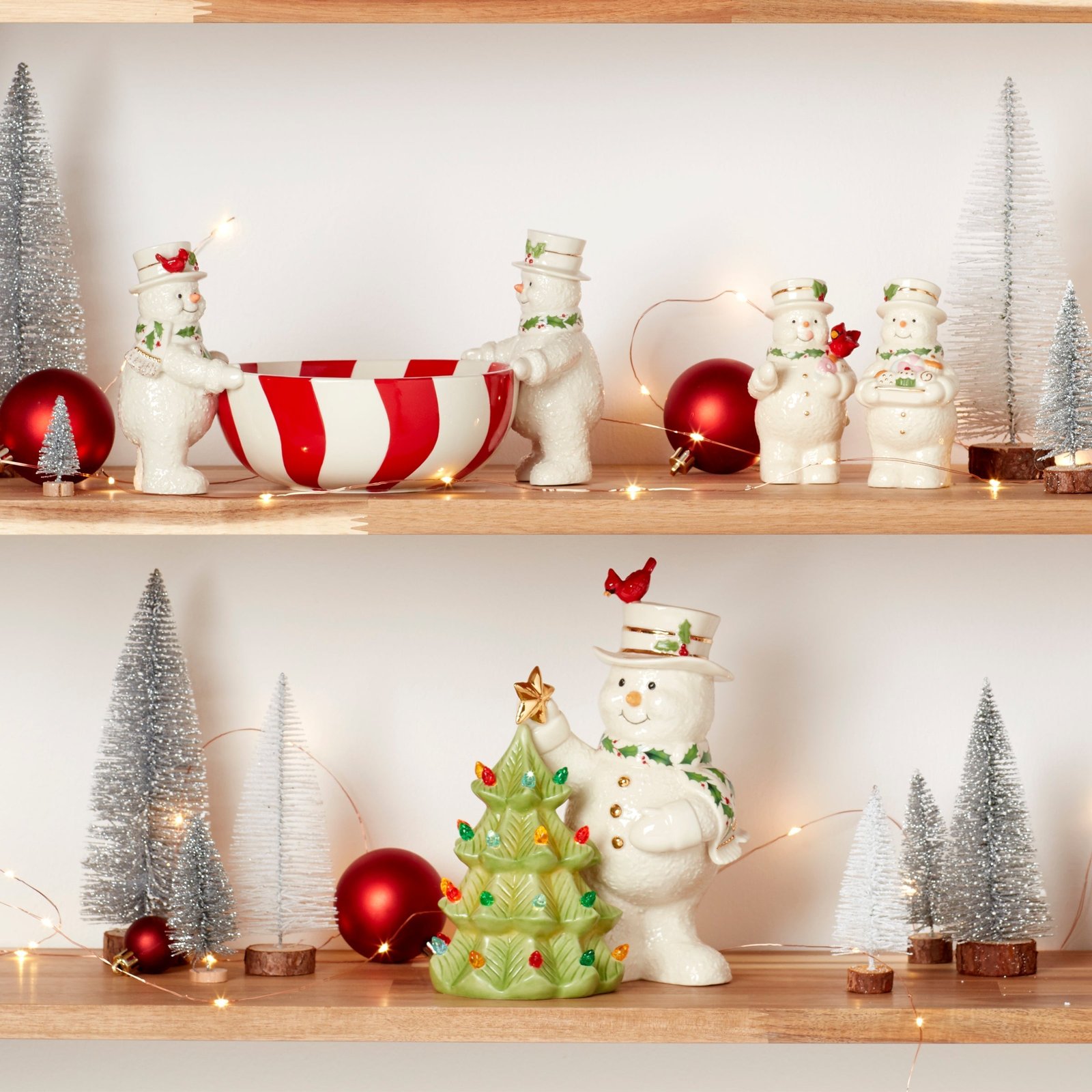 Sweeten up your table with this creative treat bowl from our Happy Holly Days collection. Two joyful snowmen hold up a small bowl that you can fill with caramels, chocolate, mints, and other sweets for your guests!